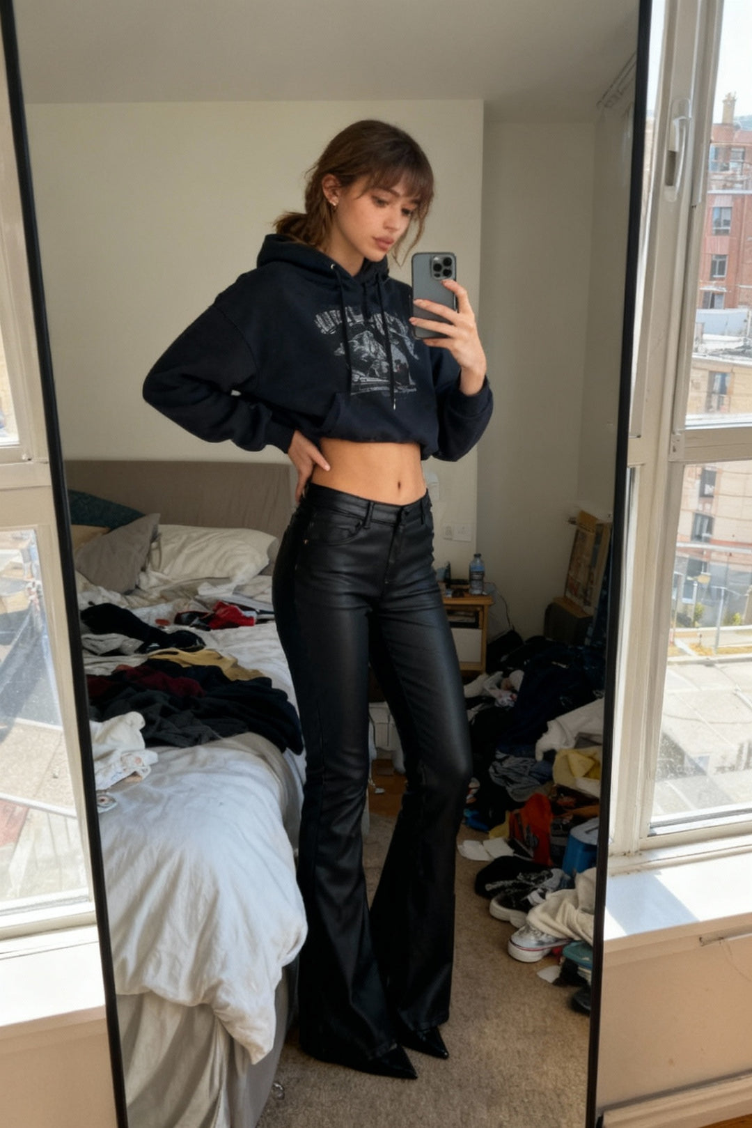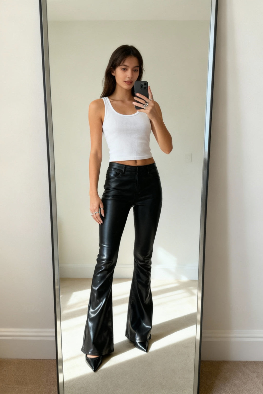 High-waisted. Perfectly flared. Sleek black finish that photographs like a dream.